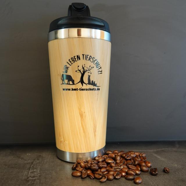 Wer viel unterwegs ist, ob im Auto, mit dem Fahrrad oder auf einer Wanderung, der freut sich, wenn er sich mit einem Heißgetränk aufwärmen bzw. stärken kann. Gemeinsam mit der Grafikerin Julia Sälzer aus Bergisch Gladbach haben wir ein wunderschönes Motiv entwickelt, der unseren Leitspruch 'Wir leben Tierschutz' auf wunderbare Weise zum Ausdruck bringt.