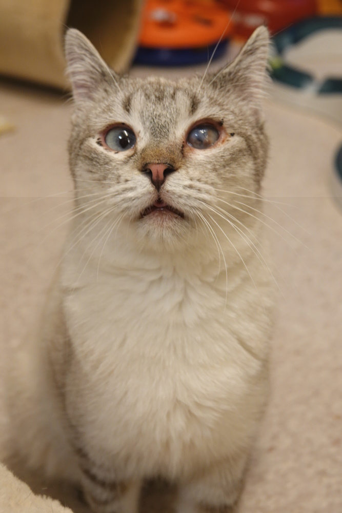 Katzen habe es in Rumänien sehr schwer, ein liebevolles und artgerechtes Zuhause zu finden. Und wenn sie dann noch erwachsen, älter oder krank sind, erst recht. Victoria leidet aktuell unter einer sogenannten Keratitis (Hornhautentzündung). Hier stehen genauere Untersuchungen aus und wir werden alles versuchen, damit ihr geholfen werden kann. Victoria selbst stört diese Behinderung gar nicht. Wir möchten sie aufgrund der Einschränkung ihrer Sehfähigkeit gerne als Wohnungskatze vermitteln. Da sie sozial kompatibel ist, wäre es wünschenswert, wenn entweder bereits eine Samtpfote vorhanden ist oder sie zusammen mit einem Artgenossen ausziehen darf. Eine wirklich richtig nette Samtpfote, die sich einen Orden als 'Schmusekatze des Jahres' mehr als verdient hat.